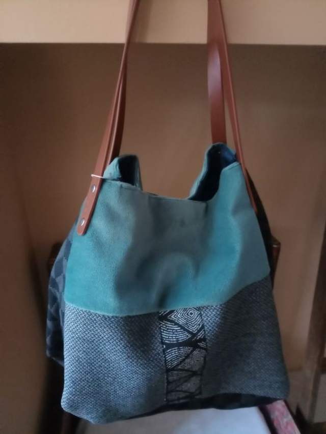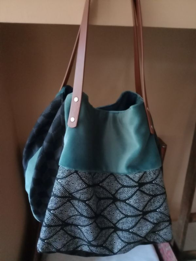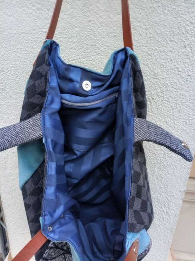 Grand sac cabas cube fait main harmonie bleue et grise velours multi matières