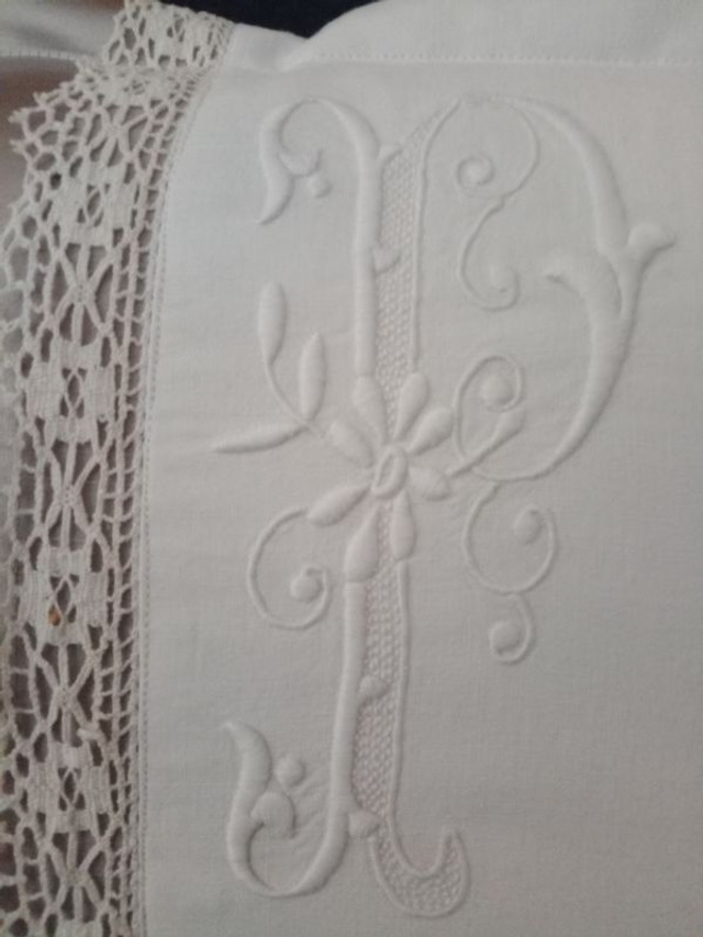 - un sublime et très grand monogramme P d'une vingtaine de centimètre avec motif floral. La qualité de la broderie est exceptionnelle.