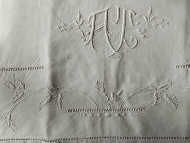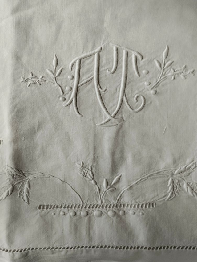 Monogramme AT sur drap avec jour échelle - motifs floraux brodés main