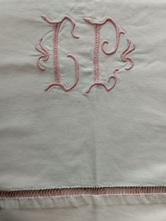 Monogramme GP brodé en rose sur drap ancien - jours échelle rose