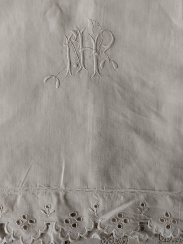 Monogramme NP sur taie d'oreiller motif gui broderie feston