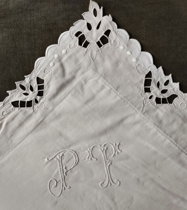 Monogramme PT provenant d'une taie d'oreiller avec broderie Richelieu tout autour de la taie.